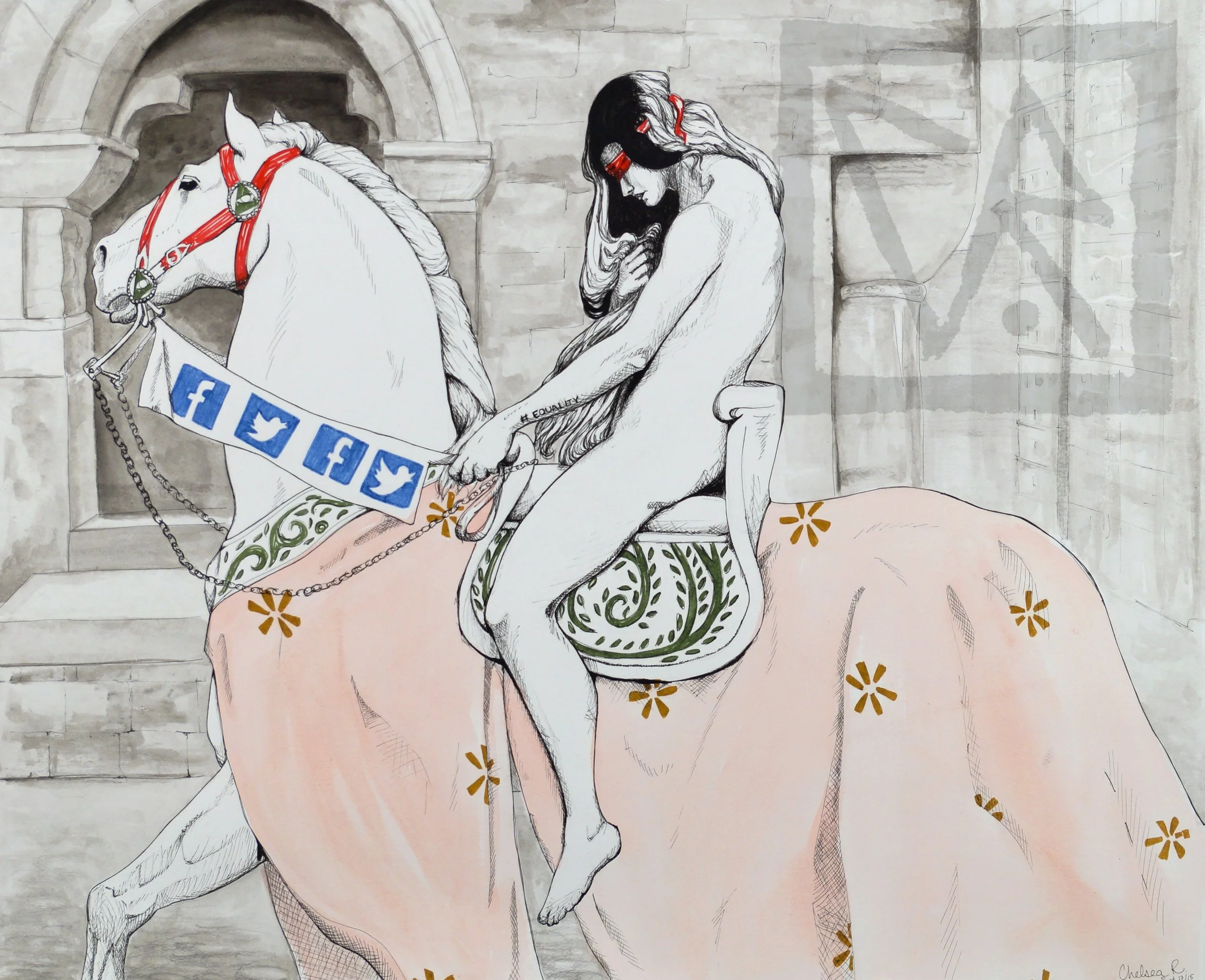 THE LADY RIDES AGAIN (micron pen, watercolour and marker on paper)